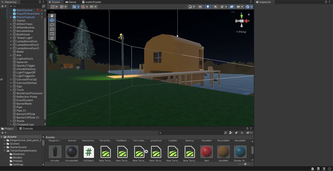 "Cabin Game"(working title) is a first person psychological horror game set during WWII. A middle-aged man is living peacefully by a lake in his boathouse, suddenly his generator goes out and he needs to gather wood to re-fuel it and get power back.